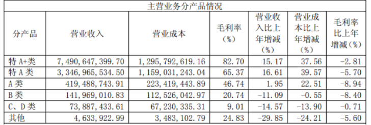 今世缘主要依靠其中高端产品带动业绩。去年,今世缘旗下特A+类酒实现营业收入74.9亿元,同比增长15.17%;特A类酒实现营业收入33.47亿元,同比增长16.61%;A类酒营业收入为4.19亿元,同比增长1.95%。